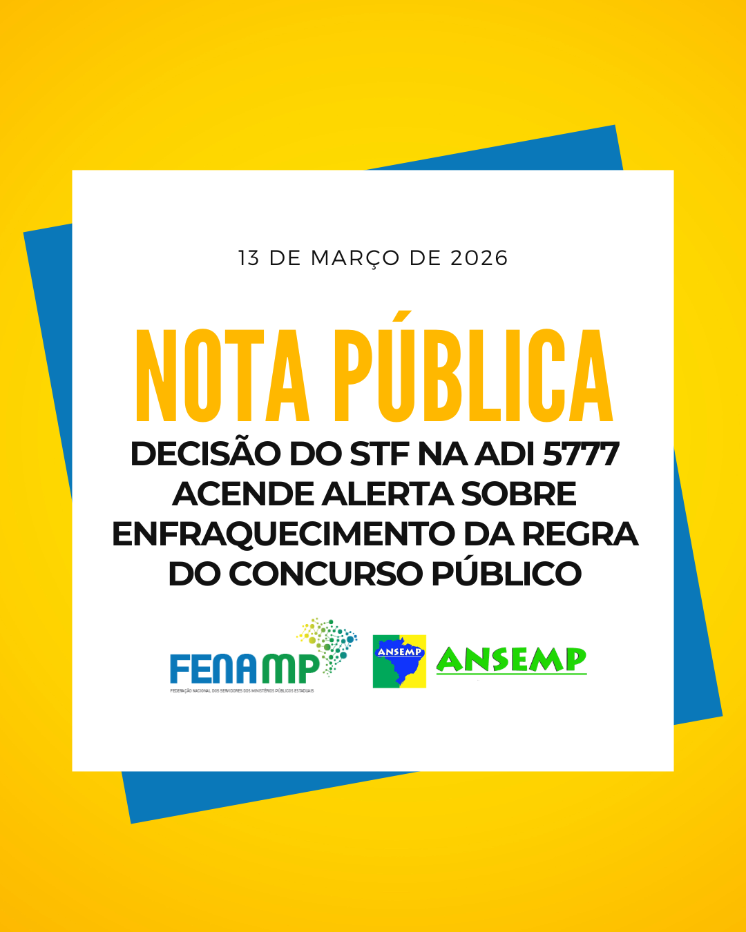 A Federação Nacional dos Servidores dos Ministérios Públicos Estaduais (FENAMP) e a Associação Nacional dos Servidores do Ministério Público da União e dos Estados (ANSEMP) manifestam profunda indignação com os possíveis efeitos institucionais da decisão proferida pelo Supremo Tribunal Federal na Ação Direta de Inconstitucionalidade nº 5777.