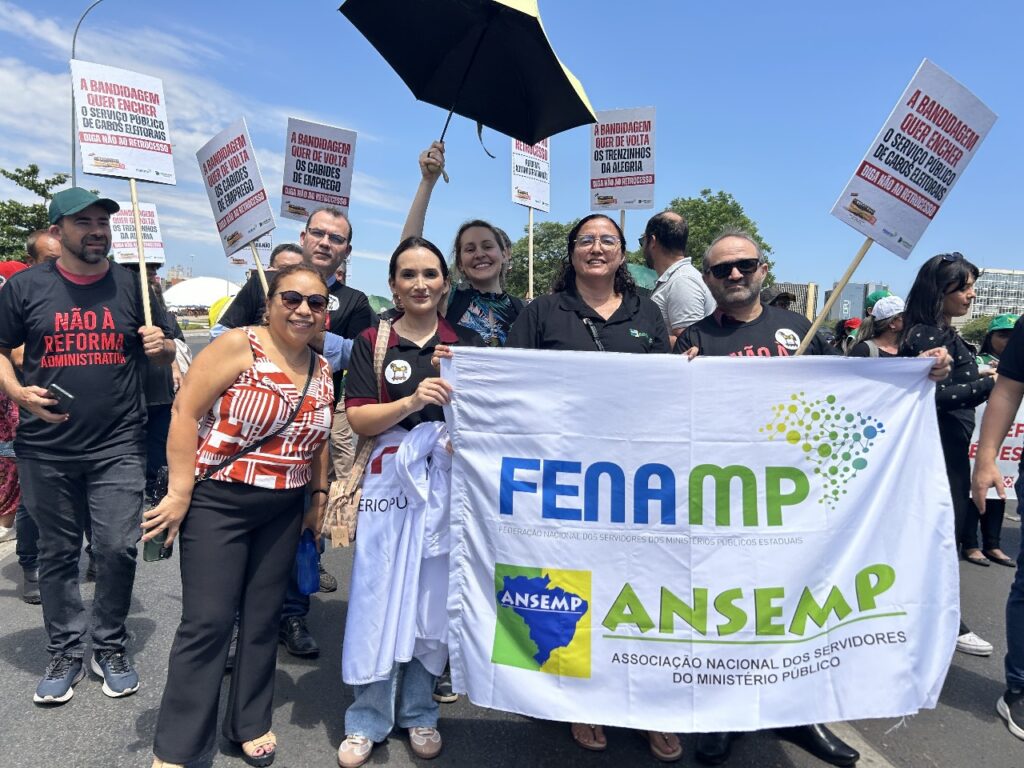 FENAMP, ANSEMP e dirigentes das entidades de base dos servidores dos Ministérios Públicos estaduais participaram, nesta quarta-feira (29), da Marcha Nacional contra a Reforma Administrativa, em Brasília. O ato reuniu mais de 20 mil servidores públicos de todo o país, que seguiram até o Congresso Nacional para protestar contra a PEC 38/2025, em tramitação na Câmara dos Deputados, que representa um grave ataque aos direitos do funcionalismo e aos serviços públicos.